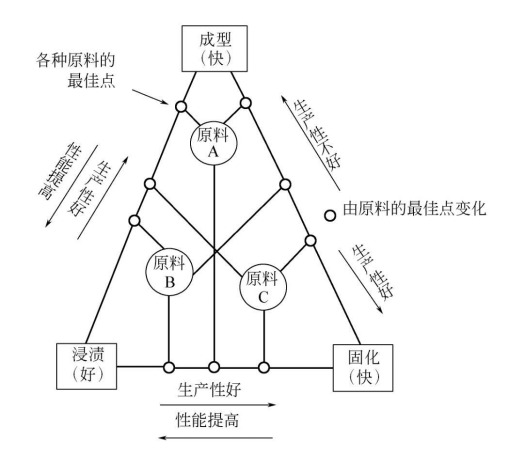 賦形、浸漬和固化三要素相互影響,通過對其有機地調整與組合,可經濟地成型復合材料制品。圖7-2示出了成型三要素與原材料的相互關系。